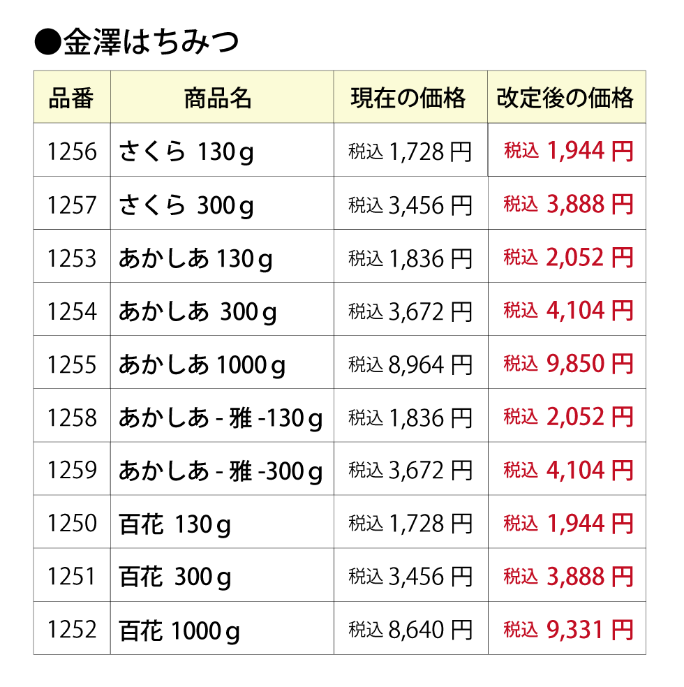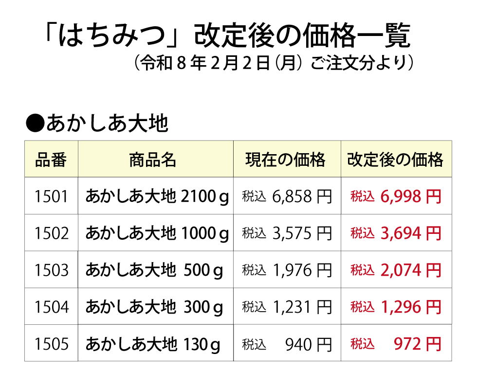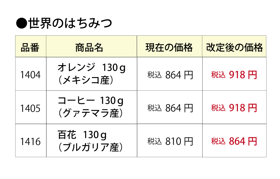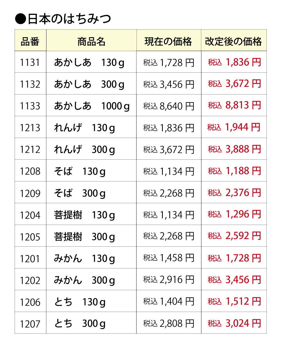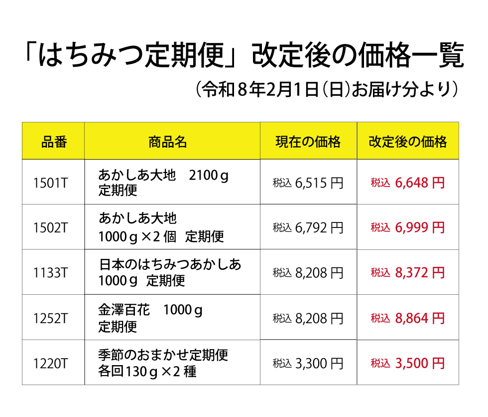 【重要】はちみつ商品およびはちみつ定期便価格改定のお知らせ
