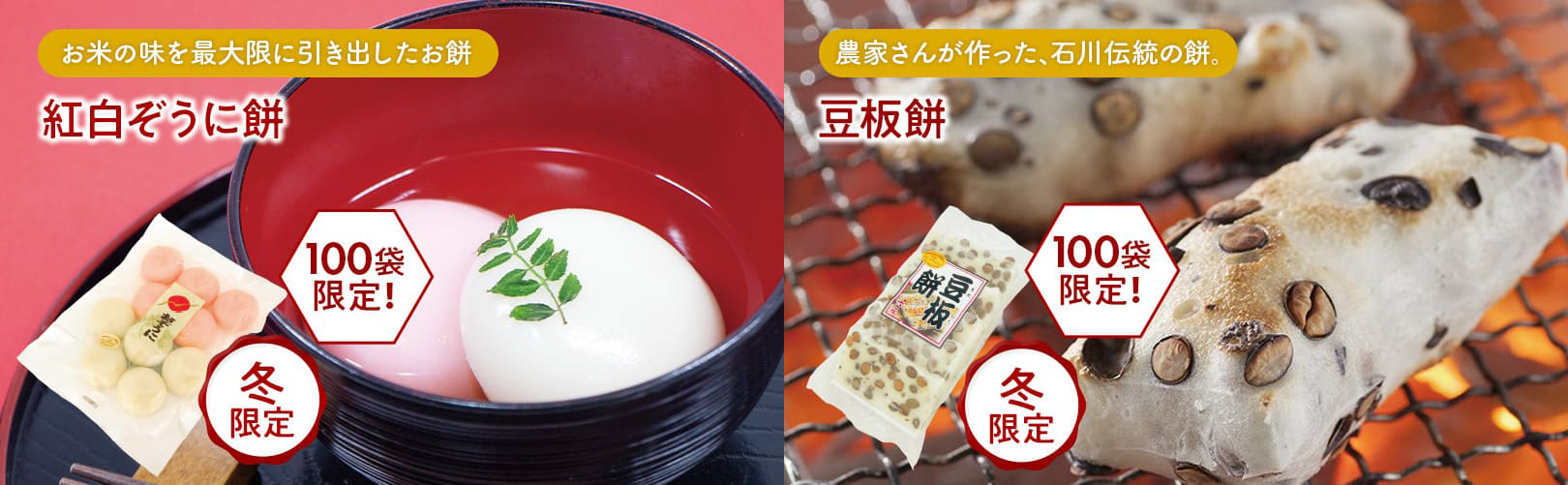 自然豊かな加賀平野で育ったもち米「白山もち」で作られるお餅。