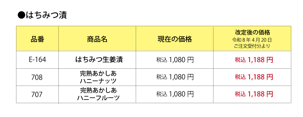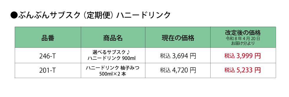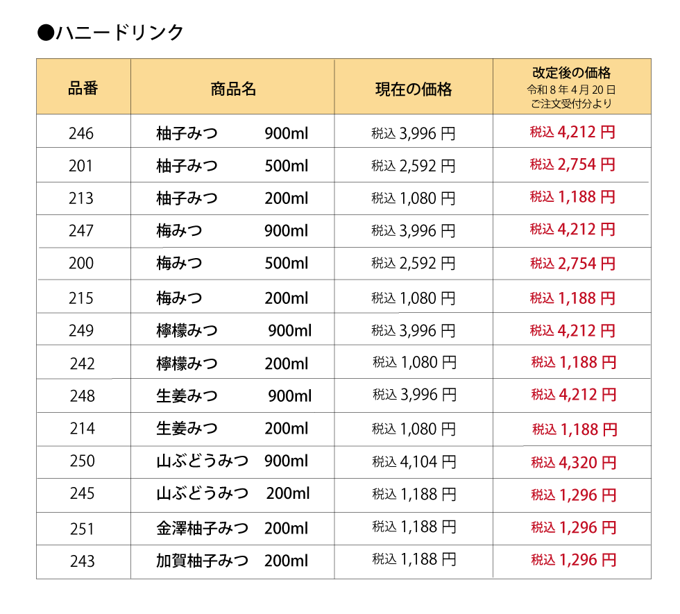 【重要】ハニードリンクおよび一部商品の価格改定のお知らせ