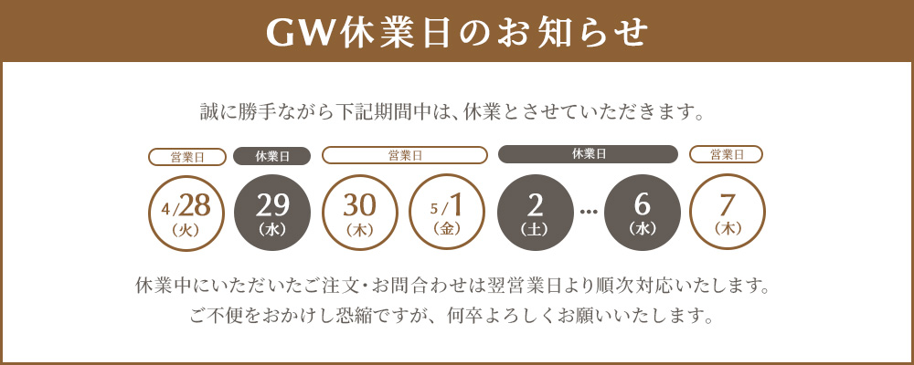 ゴールデンウィーク期間の休業日につきましては下記の通りです。