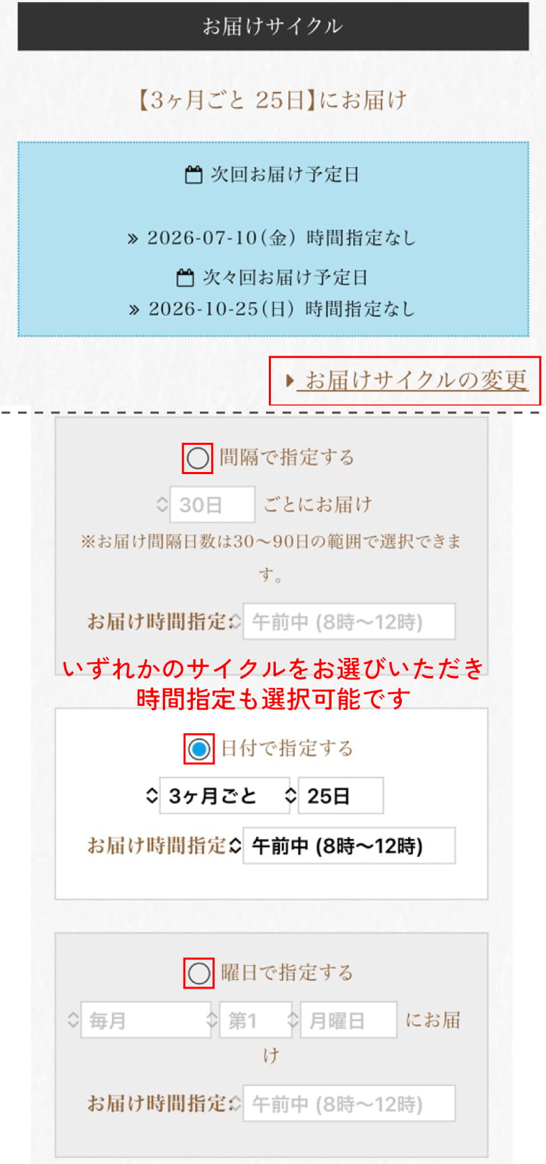 ④いずれかのサイクルを選び、お日にちなどご自由に設定ください。毎回のお時間指定もこちらから。