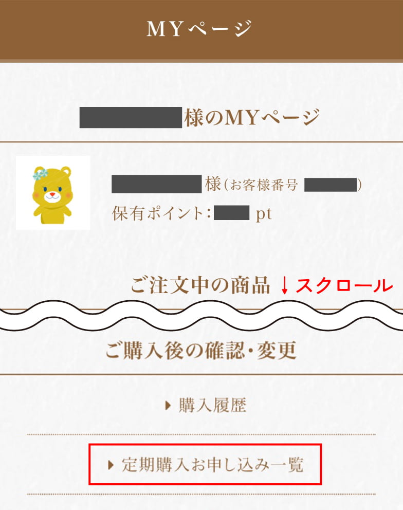 ② 「マイページ内のご購入後の確認・変更」の[▶定期購入お申し込み一覧]をタップ