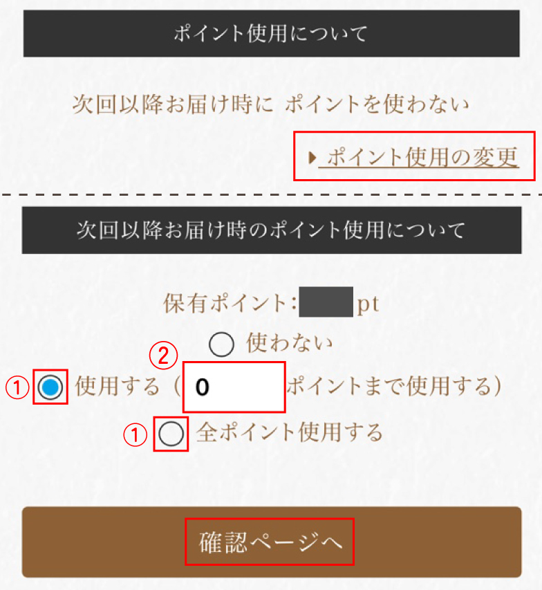 ※ここでは毎回ポイント使用する場合のみです。1回だけ使用したい場合はお手数ですがお問い合わせフォームからご連絡くださいませ。
