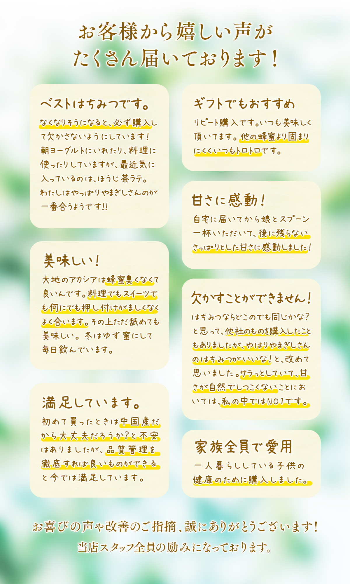 お友達から、評判を聞き、送料も無料でしたので、お試しに購入してみたら、とっても美味しくて!近年オーガニックや国産を売りにしたいろいろなはちみつが売られていますが、御社のはちみつが今まで食べてきた中で1番でした。