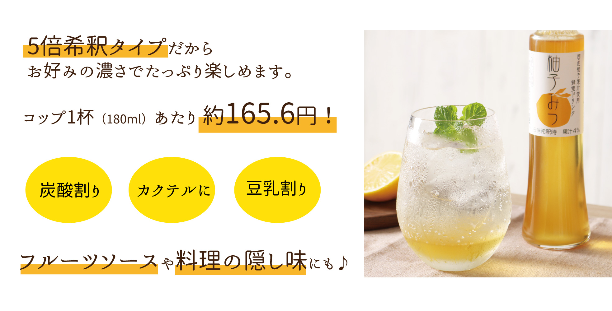 たまの楽しみに飲んでいます。nao様 この度は「ハニードリンク 柚子みつ 500ml」をご購入いただき誠にありがとうございます。さわやかな柚子の香りと苦みと酸味が絶妙ですよね♪割って飲む他、お料理にもご活用できますので、ぜひ色々とお楽しみくださいませ!毎日の健康にもお役立てできますと幸いでございます。これからも美味しいはちみつ商品をお届けしてまいりますので今後とも末永いお付き合いをよろしくお願いいたします。